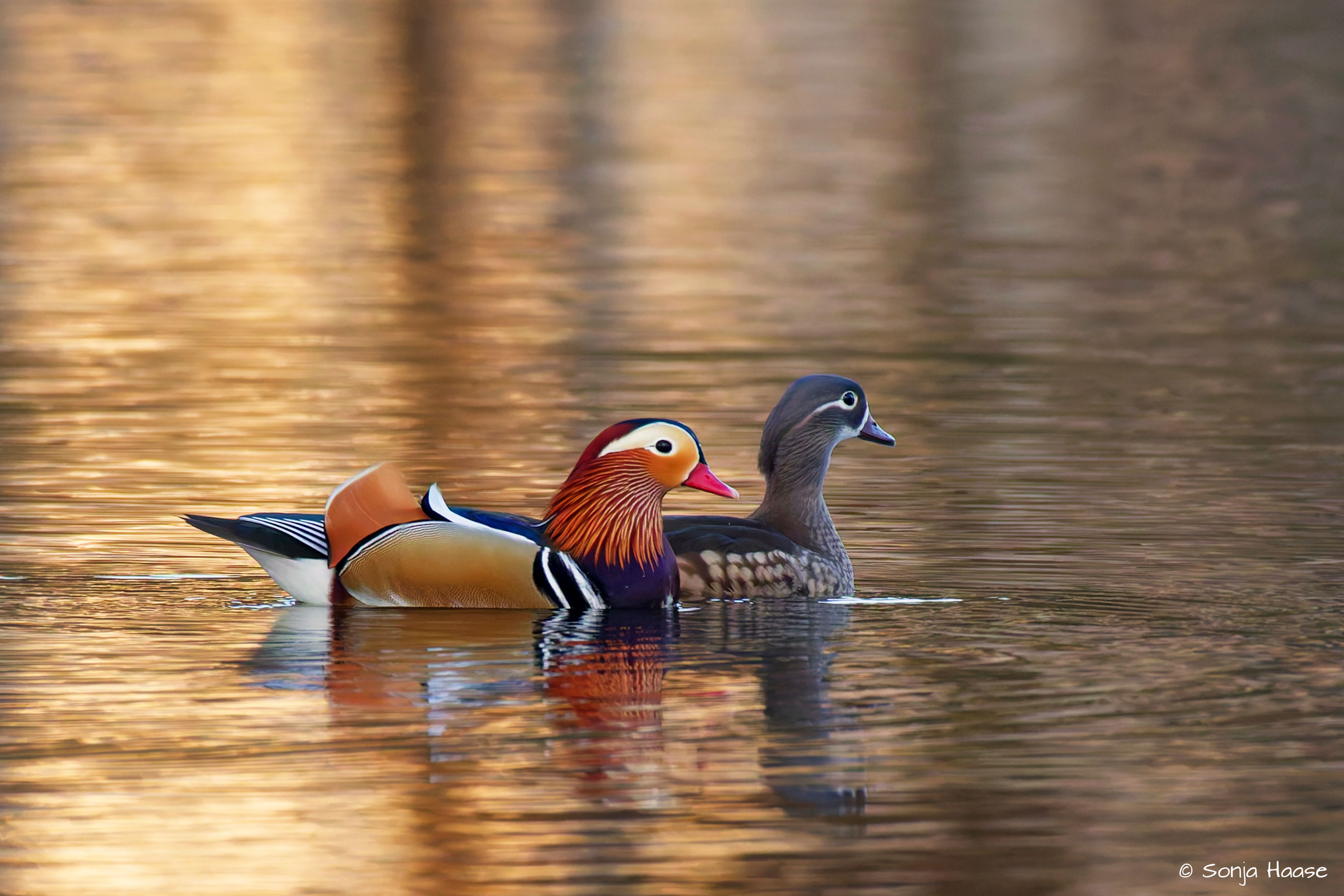 Ehepaar Mandarinenten im Abendlicht im Dezember.