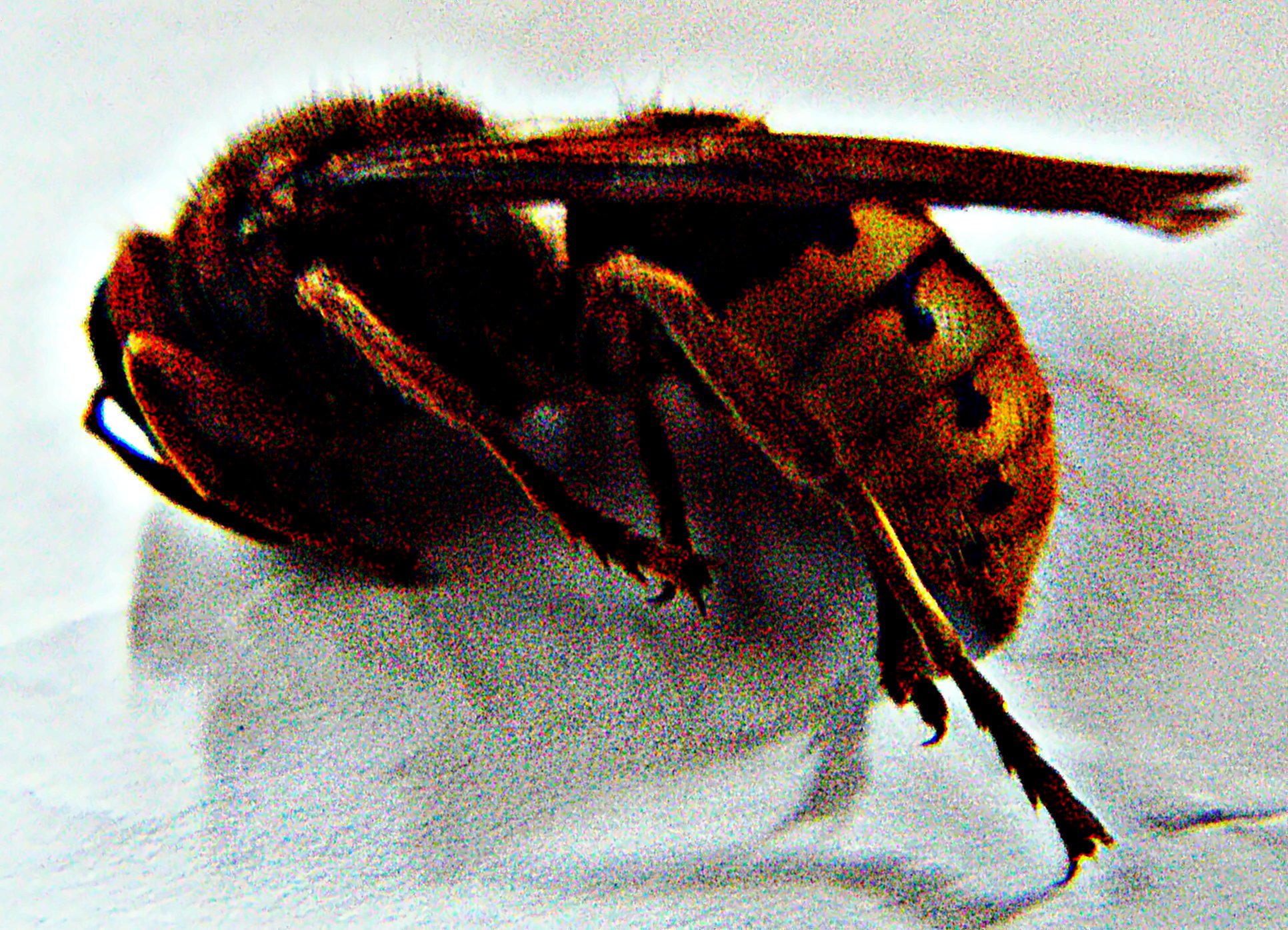 Arbeiterin einer einheimischen Hornissenart, die sich wohl verausgabt hat. https://de.wikipedia.org/wiki/Hornisse Aufnameort: Eiershausen Garten Kamera: Medion Camcorder