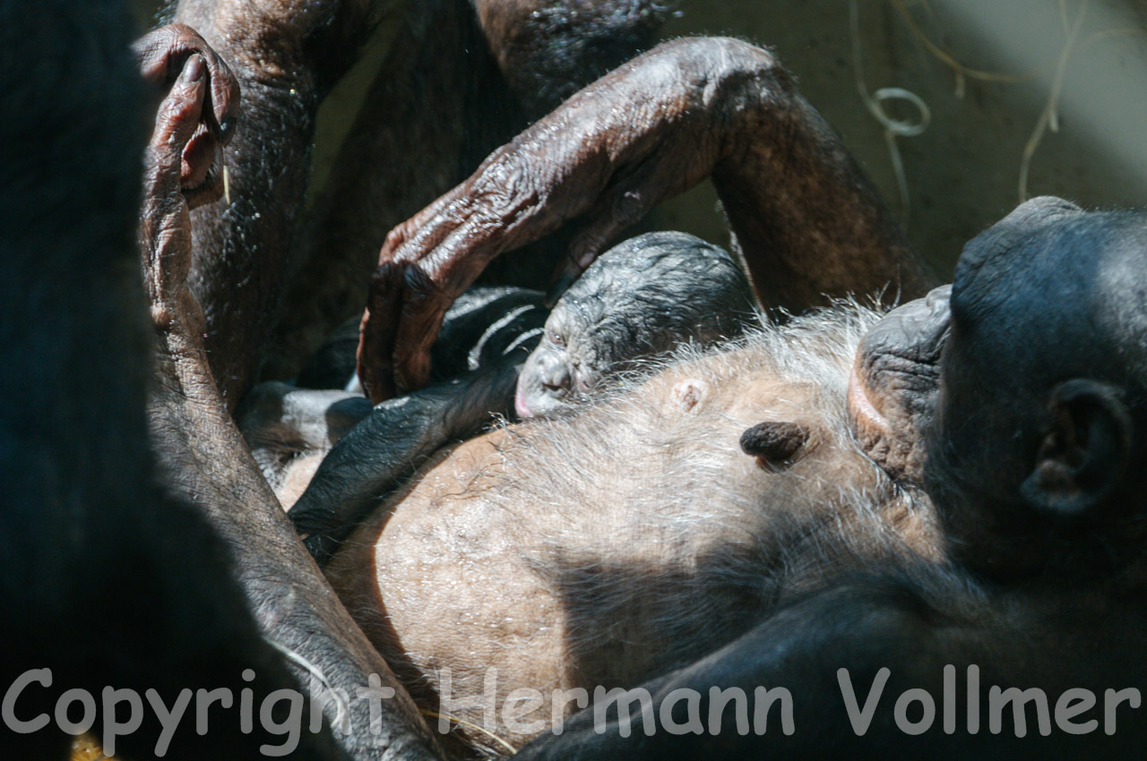 Am 5.7.2013 hatte ich das Glück, dabei zu sein, als die Bonobofrau Hermien einen Sohn gebar. Dies ist in diesem Jahr bereits die 3. Geburt eines Bonobo-Babys in der Wilhelma, die 2. im neuen Affenhaus. Ein 4. Baby wird erwartet.