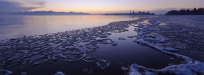 Eisschollen vor Lindau: Am Tag zuvor sah ich am Ufer des Sees die Eisschollen treiben und ging am nächsten Abend mit der Kamera hin um sie zu fotografieren.