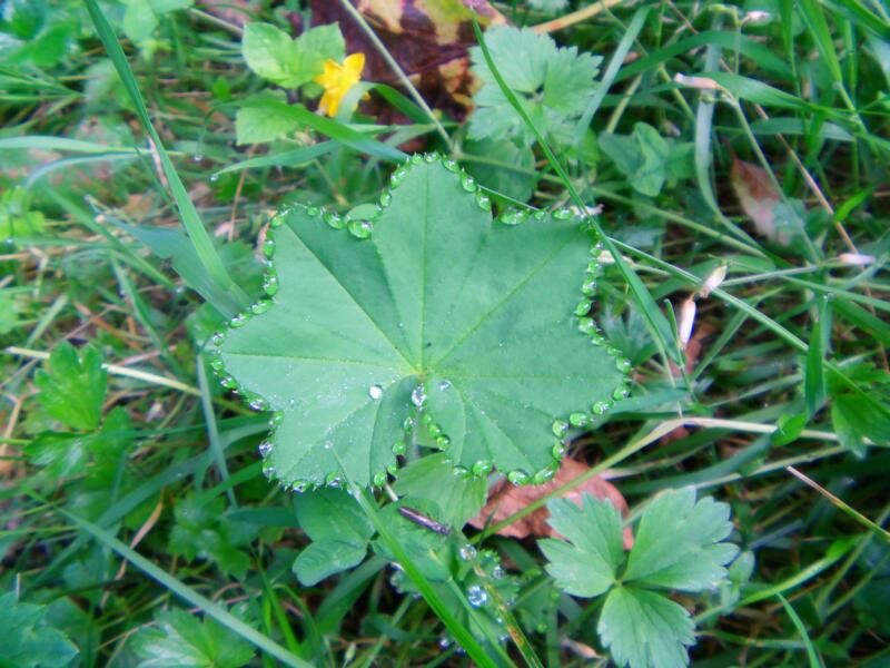 Beim gewöhnlichen Frauenmantel(Alchemilla vulgaris(L.)) kann gelegentlich an seinen Blättern Guttation(bedeutet soviel wie pflanzliche Abgabe von Wasser an den Rändern) beobachtet werden.