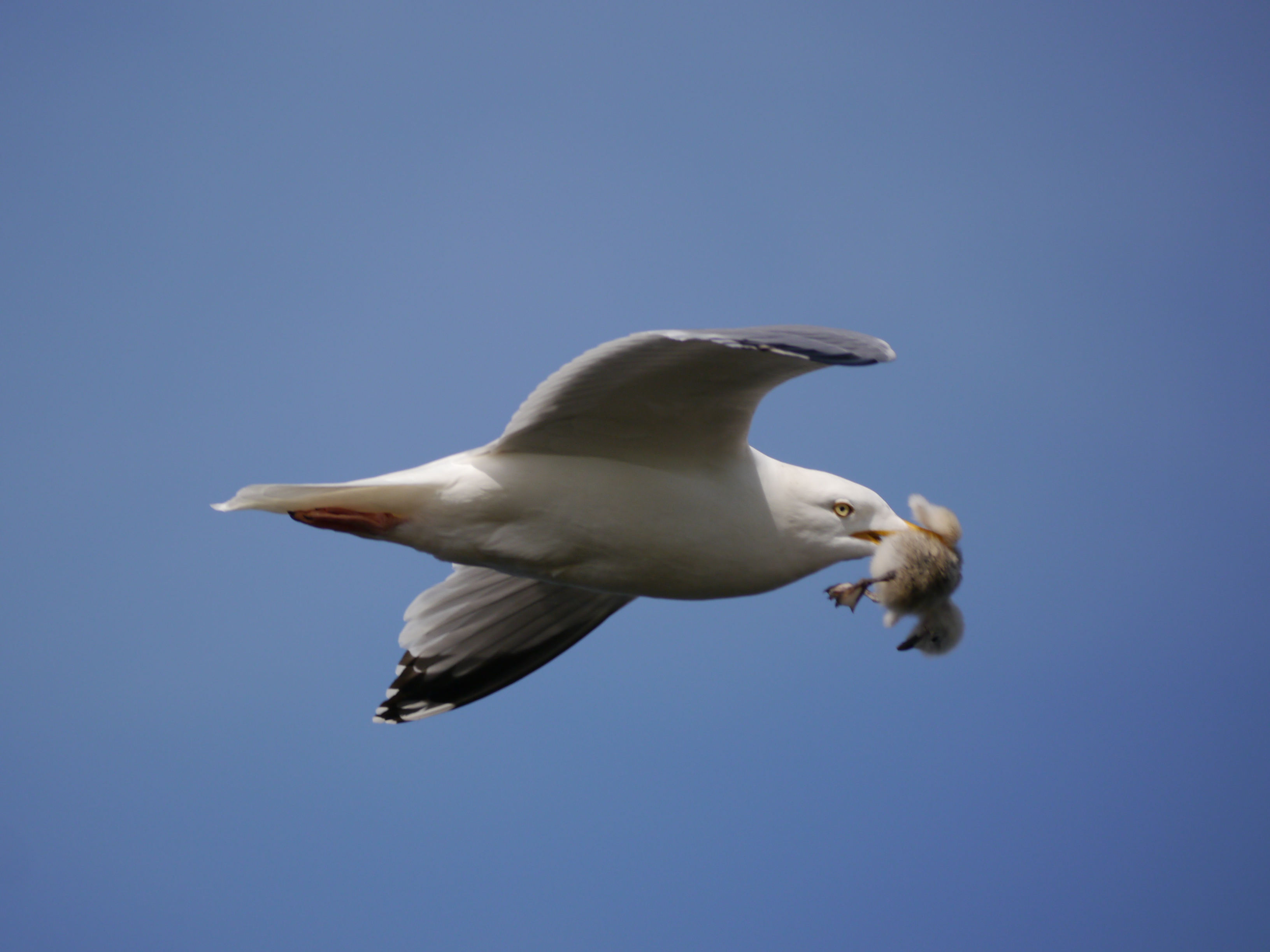 Eine Silbermöwe erbeutet eine junge Dreizehenmöwe und fliegt an den Besuchern auf dem Klippenrundweg entlang Aufnameort: Helgoland Kamera: Sony Alpha 77II