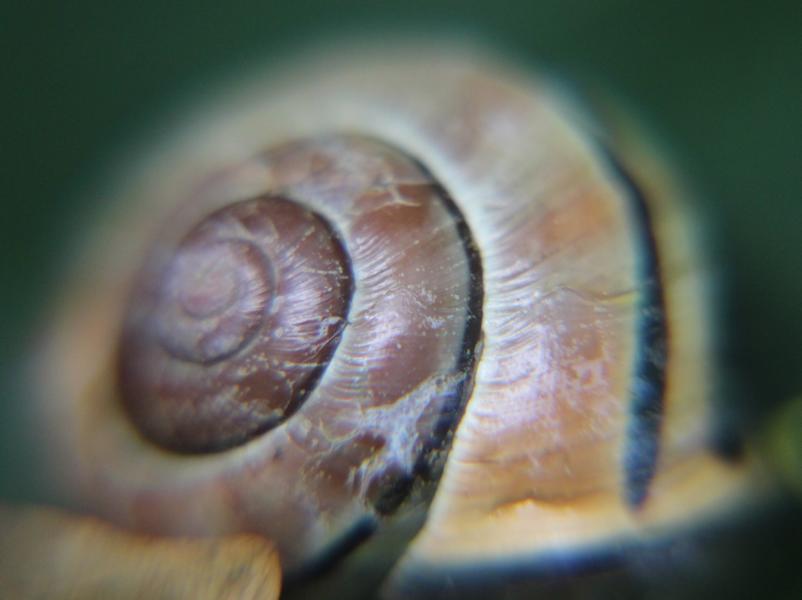 Eine Gehäuseschnecke, deren Gehäuse oft ein oder mehrere bräunliche Längsstreifen tragen kann.