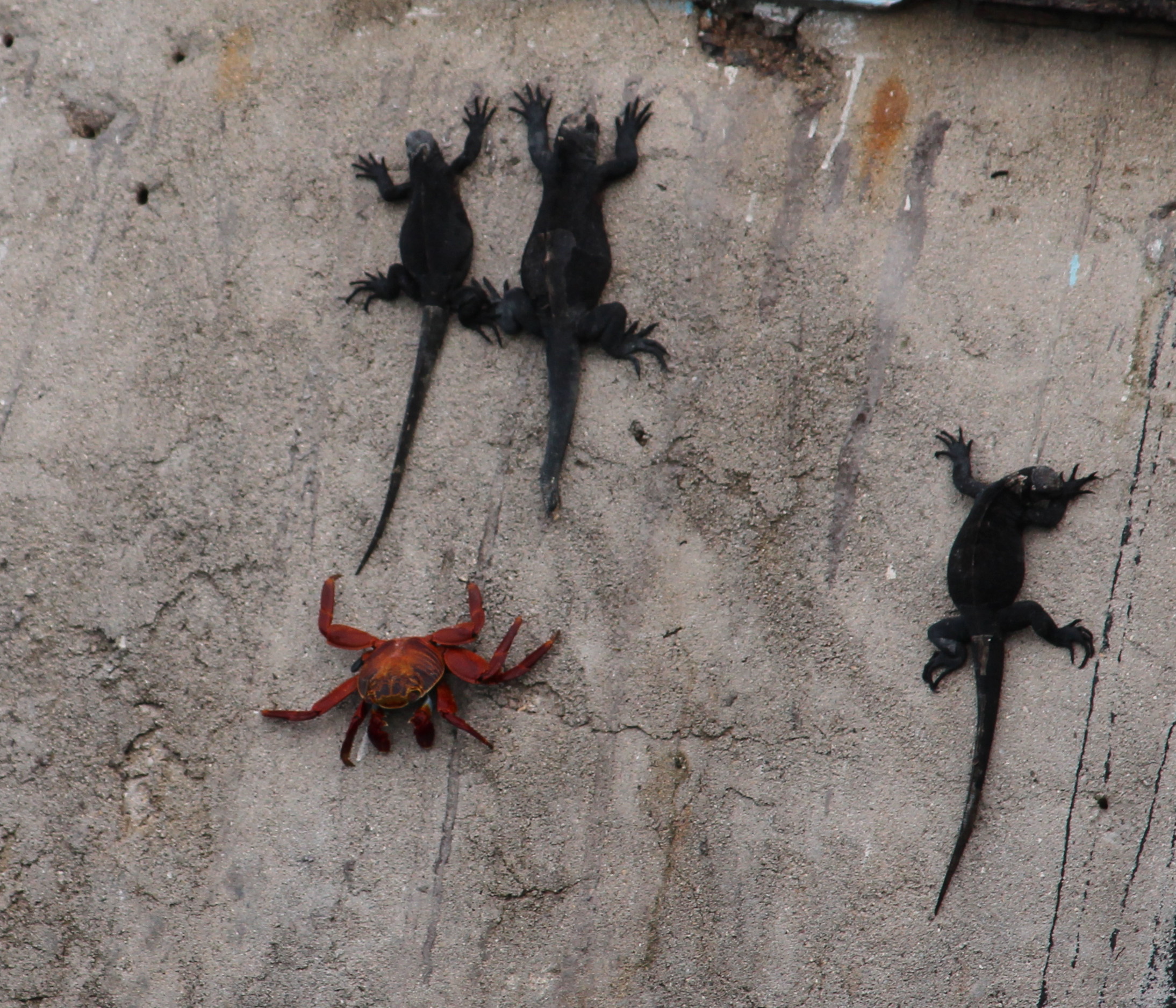 Meerechsen und Klippenkrabben bevölkern die Betonmauern. Bei der mittleren Meerechse fehlt ein Stück Schwanz. Sie hat es wahrscheinlich verloren, weil sich Robben ein Vergnügen damit bereiten, Meerechsen, die an Land wollen, immer wieder an ihrem Schwanz ins Meer zurück zu ziehen.