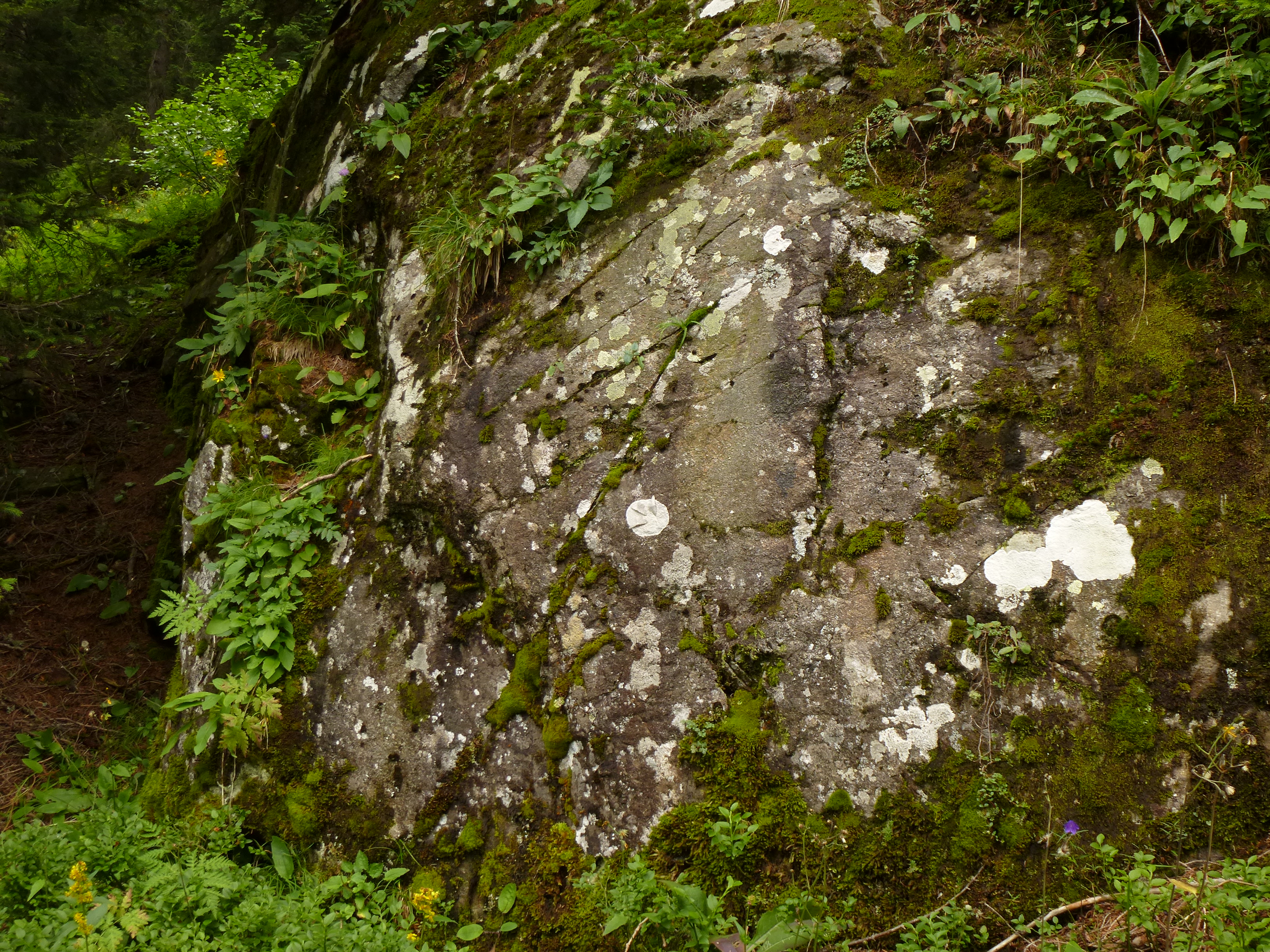 Auf einem Fels fielen mir weiße Flechten-Flecken auf. Allerdings kamen mir drei abstrakt-gerade Linien seltsam vor. Aufnameort: Bei Damüls, Österreich, Vorarlberg Kamera: Lumix TZ 25